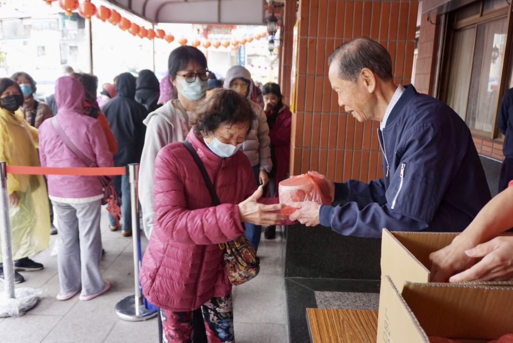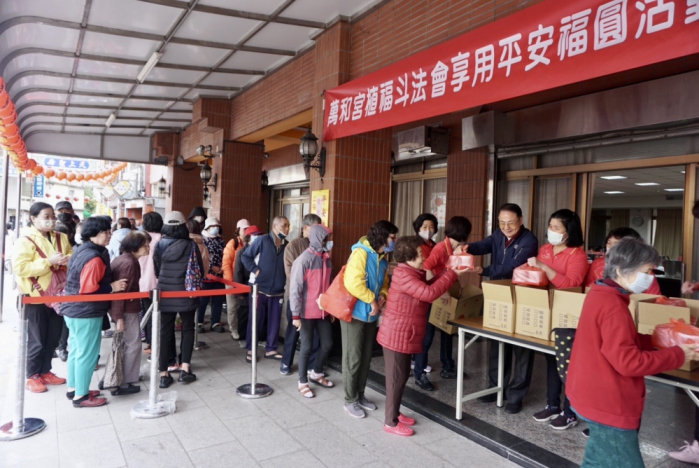 將近8點就有信眾排隊等候,領取湯圓及夀麵時,蕭董事長和他們親切互動,「祝福大家平安!」「呷平安!」「謝謝!」「萬和宮的湯圓及平安夀麵,都很好吃!」其餘董監事,也給信眾們獻上最大的祝福,互動熱絡。