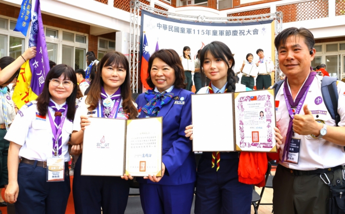 黃市長說,童軍教育培養學生的品格、團隊合作與服務精神,今天嘉義市獲全國績優童軍團表揚的團隊共有博愛國小、嘉大附小及常民童軍團等三個單位,常民童軍團林秋娟伙伴也因對童軍的貢獻榮獲銅鹿獎章肯定、幼獅童軍賴奕靜則晉升國花童軍。