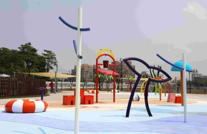 公園內親水公園以「兒童戲水區」為核心主軸,規劃設置安全且具互動性的親水遊憩設施,並搭配完善的休憩空間與景觀綠化設計,提供親子共遊的優質環境。