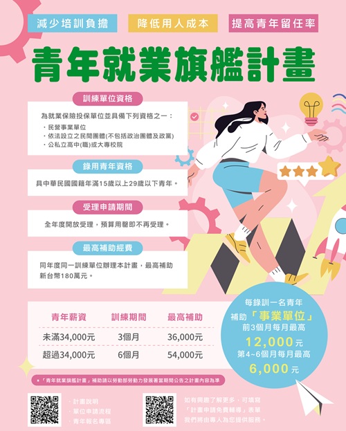 在補助措施方面,劉邦棟說明,企業若進用15至29歲青年後,前3個月每人每月補助1萬2,000元;若薪資達3萬4,000元以上,第4至6個月再加碼補助每人每月6,000元,最高每人可獲5萬4,000元補助;單一企業每年最高補助180萬元,實質減輕企業用人成本。