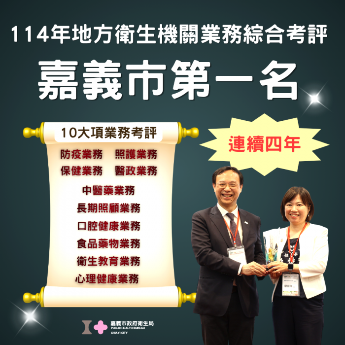 嘉義市更在「醫政」、「衛生教育」、「口腔健康」、「心理健康」、「食品藥物」、「中醫藥」、「長期照顧」等7項業務榮獲分組第一名,以及榮獲「衛生教育業務精進獎」,展現嘉義市全方位公衛實力。