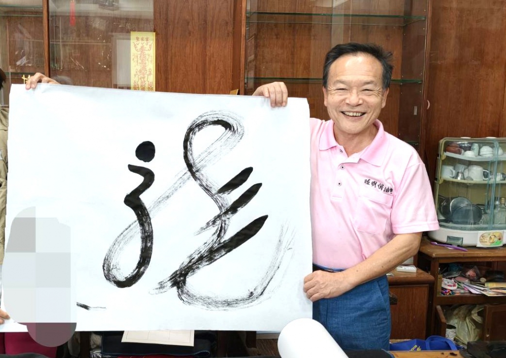 活動現場,陳明順親自揮毫,以大幅宣紙創作巨型龍字。從沾墨到落筆,每一筆都需高度專注,並考量整體平衡與視覺張力,展現其獨樹一格的筆觸風格。