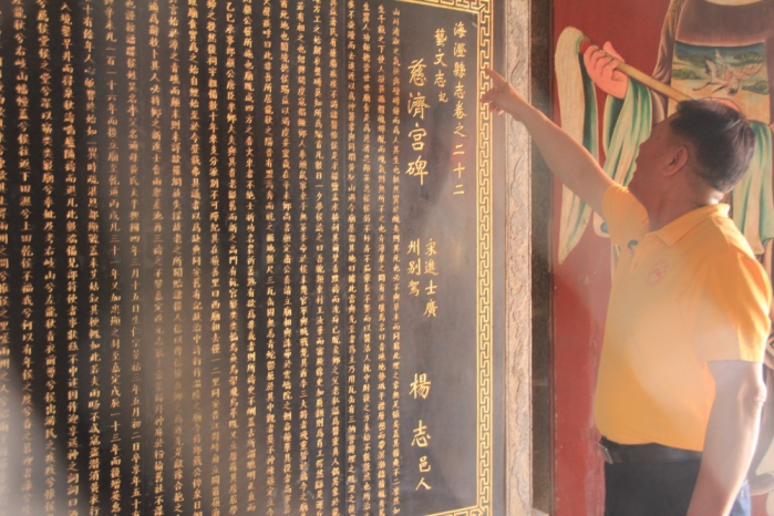 顏國強比劃著東宮後殿,說明在1990年代,台灣同胞就已經捐款贊助青礁祖廟重修,之後兩岸往來不絕,保生文化節也已經連續辦了19年。