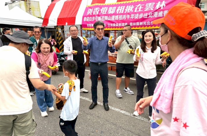 現場除了發放雲林在地優質香蕉補充體力,更特別發送「民主香燈腳」飄帶,邀請信眾一同感受媽祖慈悲,並祈求國泰民安。