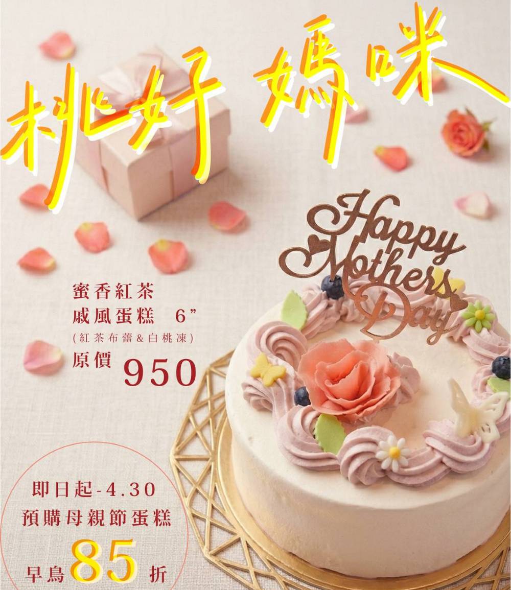 奧朵爾同步推出母親節主題蛋糕「桃好媽咪」,以白桃凍、蜜香紅茶戚風蛋糕,呈現蜜香紅茶與白桃的清甜風味。凡預訂母親節饗宴,即可獲贈6吋蛋糕(市價820元);單獨訂購蛋糕於4月30日前亦享85折優惠。由於餐點與蛋糕皆為手工製作,建議提前3天預訂,以確保最佳品質。