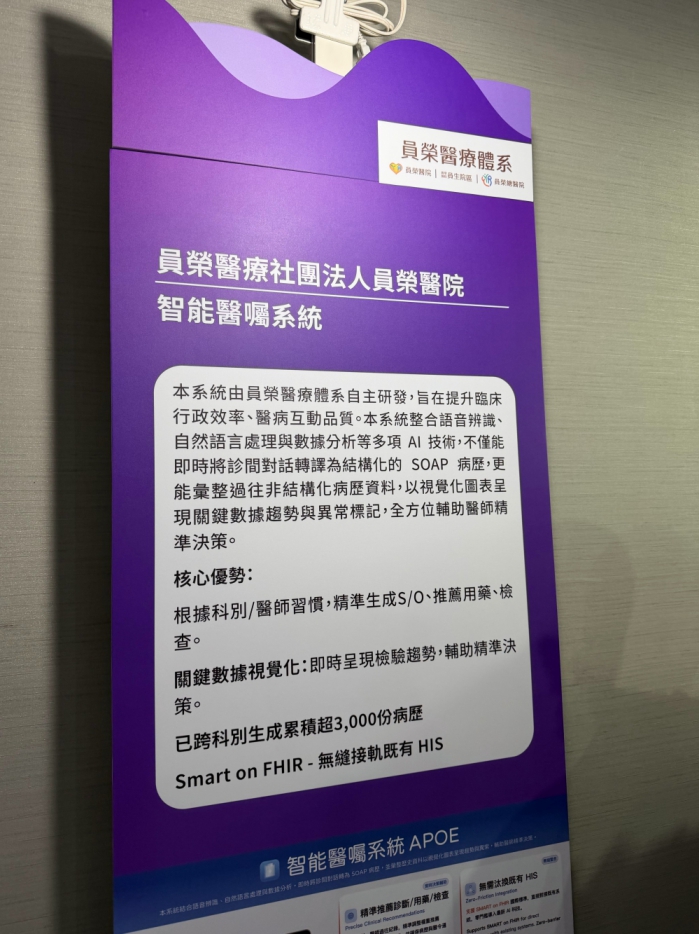 員榮醫院說,以自主研發的「智能醫囑系統」(APOE),成為全台360家地區醫院唯一獲獎的醫院,衛福部處長李建璋說,台灣各醫療院所電子病歷系統,長期各自為政,格式互不相通,民眾跨院就醫,往往需要自備光碟或重複檢查,114年起導入國際通用的「SMART on FHIR」架構,目標是讓醫療應用程式可像手機App一樣「即插即用」,在不同醫院系統間自由運行,打破過往封閉的資訊孤島。