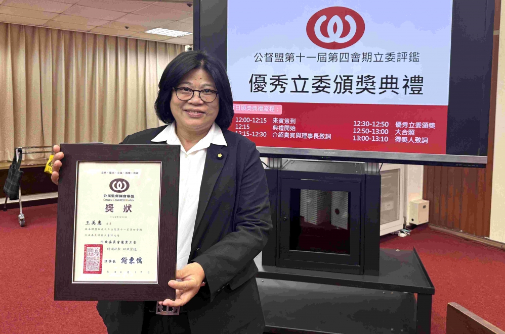 【雲嘉特派員陳信利/嘉義市報導】立法委員王美惠今天(17日)獲「公督盟」頒發優秀立委頒獎。王立委表示,本屆已連續4個會期獲選優秀立委、每會期都獲肯定,兩任立委累計8次獲獎,並6度榮獲「口袋國會」優良立委肯定,她感謝公民團體對其問政的肯定!