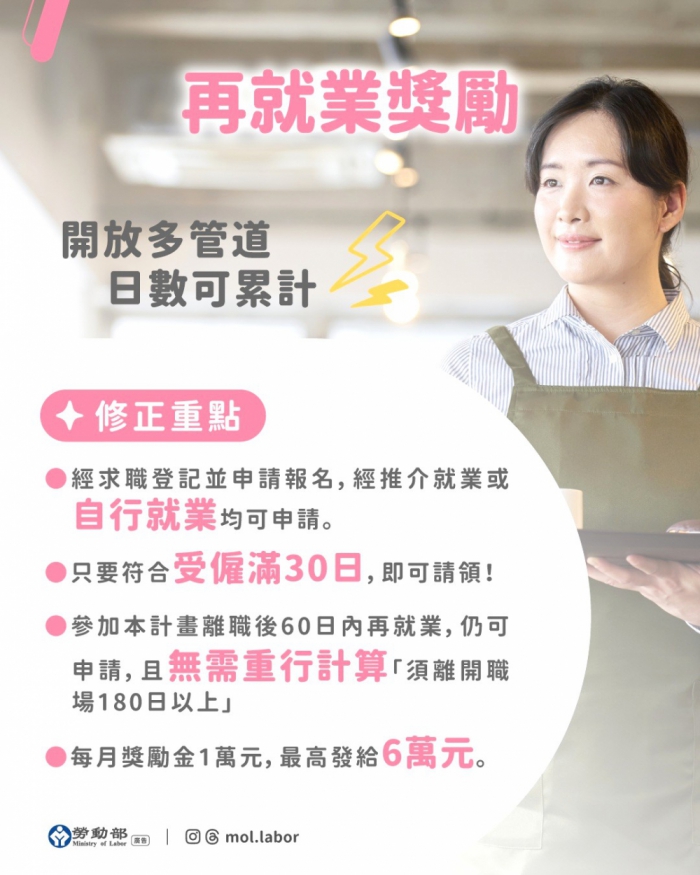 同時,再就業獎勵也由原本需就業滿90日一次發給3萬元,調整為每滿30日即可請領1萬元,最高可領6萬元,讓婦女在重返職場初期,即便無法適應也不用再硬撐90日,就能獲得更即時的支持與鼓勵,減輕重新適應工作的壓力。