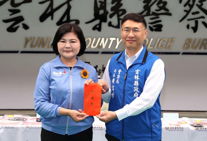縣長張麗善肯定雲林縣警局在今年度第一波肅槍、緝毒及打詐專案工作表現亮眼,今天(23日)特別偕同雲林縣警察之友會理事長吳政憲到縣警局頒發慰勞金,鼓勵慰勉基層同仁辛勞付出。