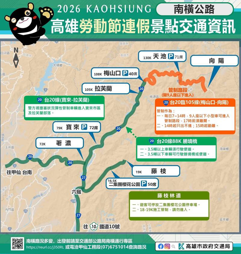 交通局表示,旗山美濃地區由於熱門景點周邊道路狹窄,連假期間台28線與中山路段易發生壅塞,呼籲前往六龜、茂林地區的遊客可提前從里港交流道下走替代道路,避開尖峰路段,共同維護客家庄的交通順暢與遊憩品質。