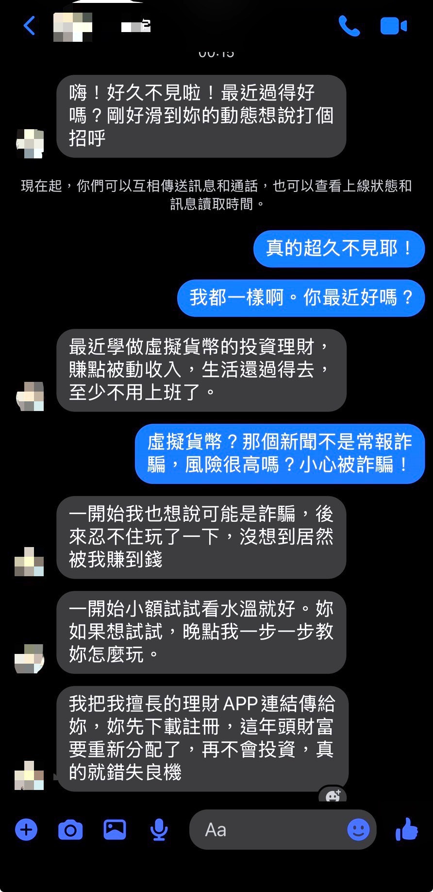 1.「查證親友身分」:遇久未聯絡親友突推薦投資,務必以電話或實體見面多方查證,慎防帳號遭盜用。